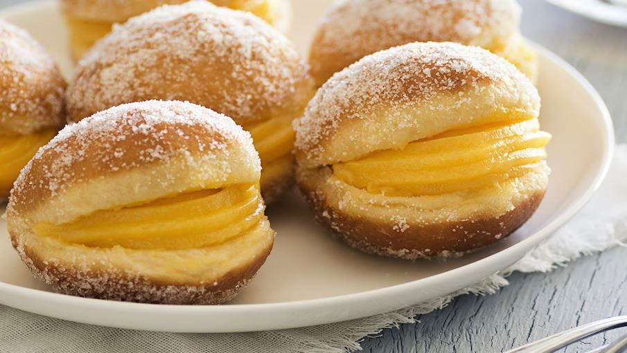 Bolas de Berlim are Portuguese donuts that are sliced in half, then filled with sweet and creamy egg-based custard. Fluffy on the exterior and thick and creamy on the interior, these donuts are typically rolled in granulated sugar before being filled with the custard.