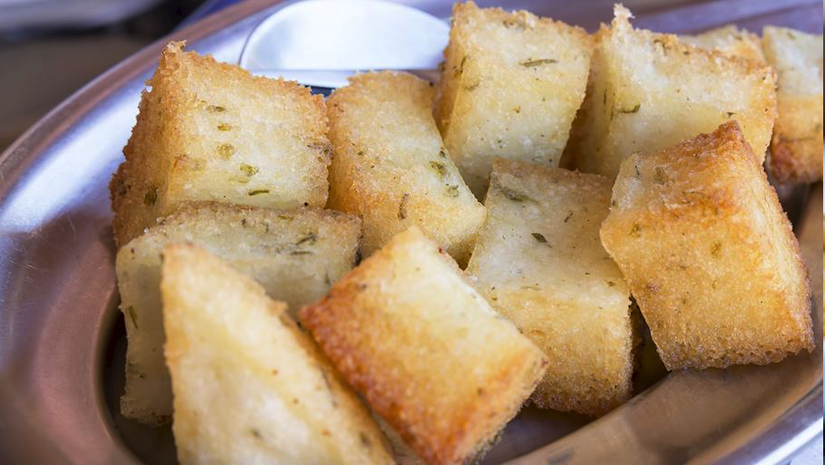 Milho frito is a traditional Portuguese specialty made with cooked cornmeal that is cut into small squares and fried in oil. It originated as a frugal dish in the Portuguese region of Madeira, and was initially prepared plain. Today it is usually enriched with thinly sliced cabbage, garlic, and a variety of fresh herbs.