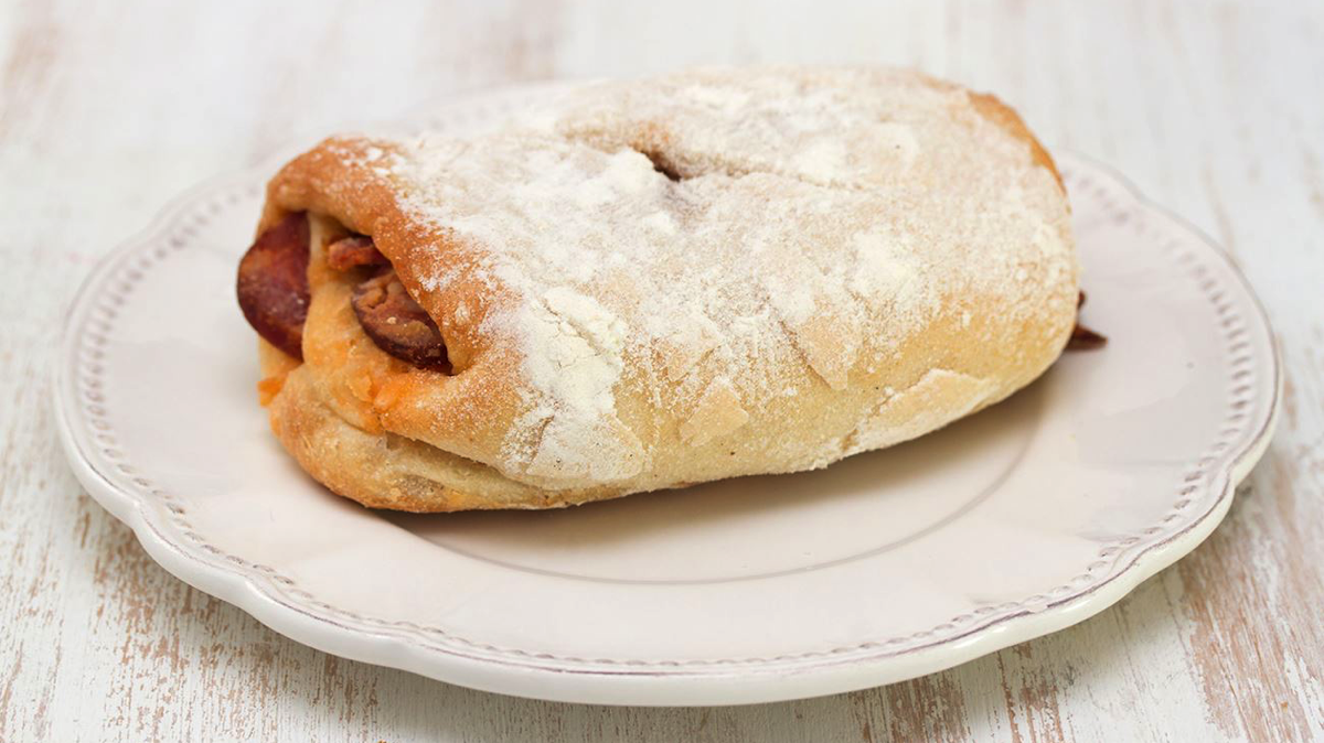 Pão com chouriço is a traditional Portuguese snack. It consists of yeasted dough rolls that are filled with the famous pork sausage known as chouriço. The bread rolls are usually made with flour, yeast olive oil, salt, and slices of chouriço sausage.